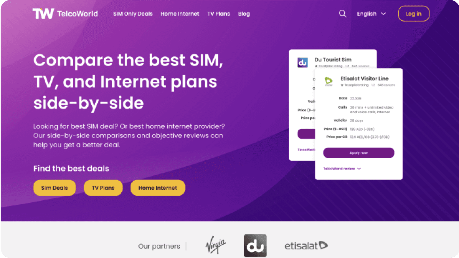 Uue idufirma TelcoWorld disain, mis pakub telekommunikatsiooni teenuste võrdlusi külastajatele ja ajutistele elanikele.